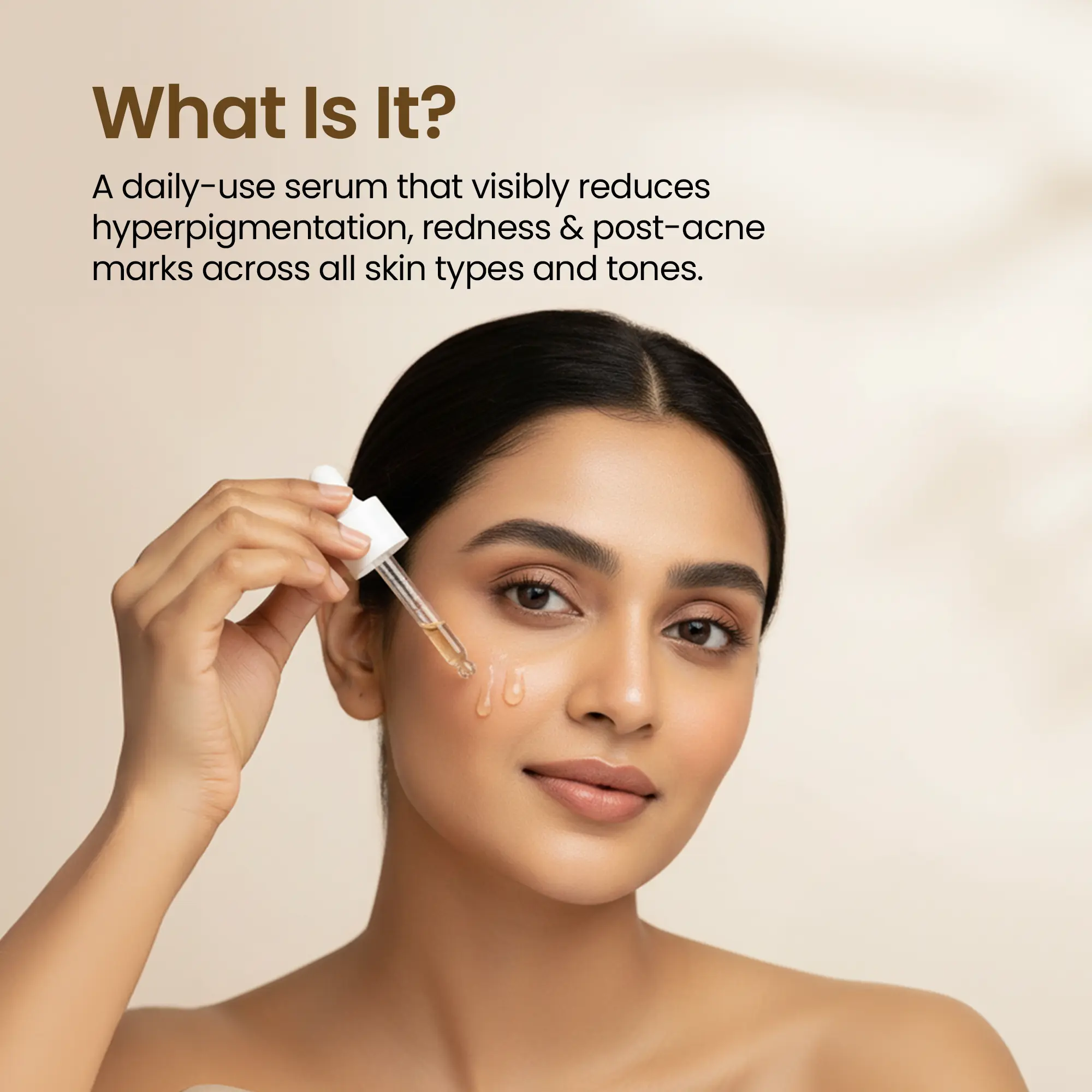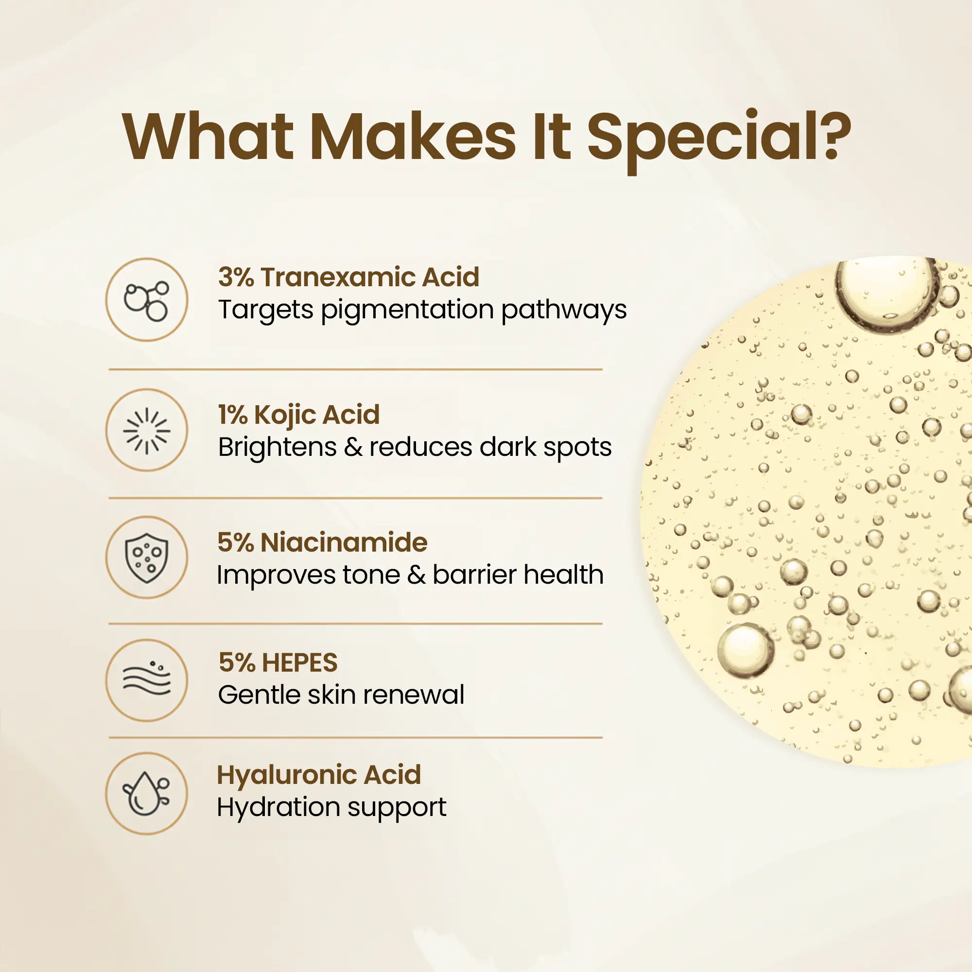 It combines a clinically effective depigmenting trio: 3% Tranexamic Acid, 1% Kojic Acid, and 5% Niacinamide, supported by 5% HEPES, to improve skin brightness, even tone, and help prevent discolouration from returning.