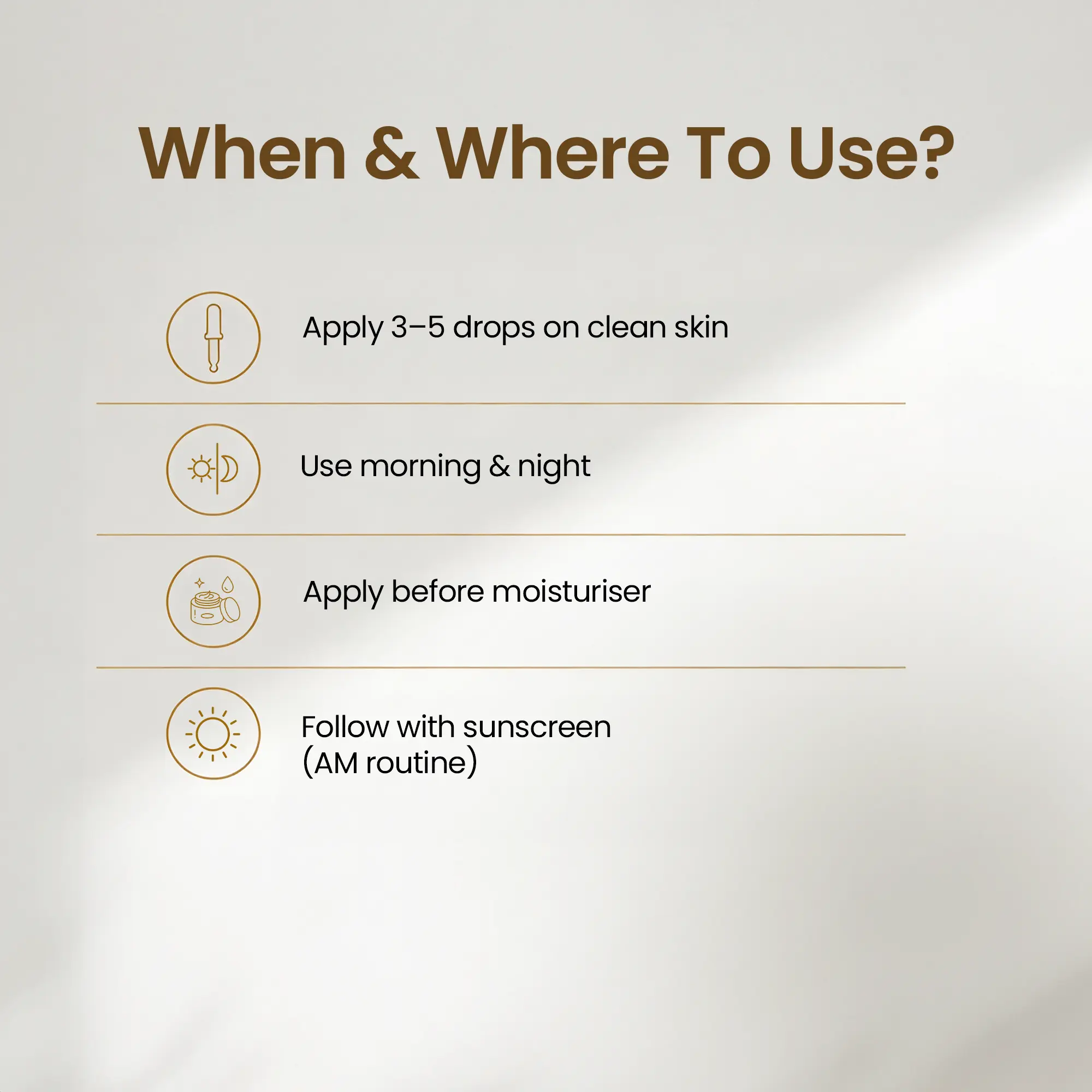 Apply 3–5 drops evenly to the face. Avoid applying to broken or irritated skin.